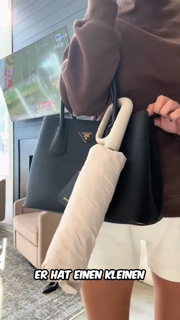 Dank des drehbaren Griffs, der sich in einen Haken verwandelt, kannst du den Schirm im Handumdrehen am Rucksack oder an der Tasche befestigen. Kein Platzbedarf, immer griffbereit, wenn du ihn brauchst.