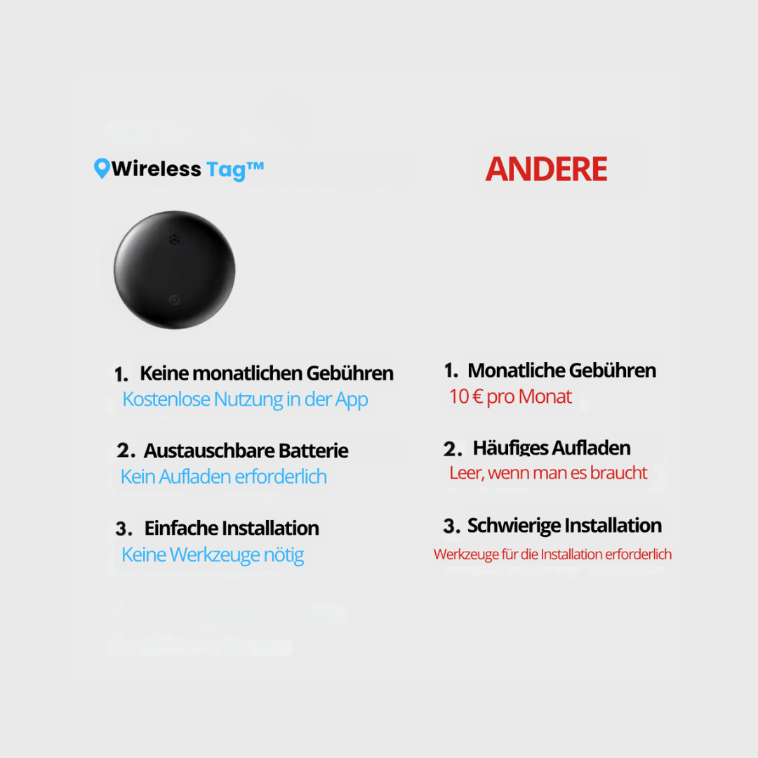 Stell dir vor, du bemerkst, dass dein Auto verschwunden ist. Diese Hilflosigkeit ...Aber mit dem Wireless Tag kannst du die Position deines Autos ganz einfach direkt auf deinem Smartphone verfolgen – während andere noch ratlos dastehen.Kein kompliziertes Setup, keine monatlichen Gebühren – einfach aktivieren und dich sicher fühlen.